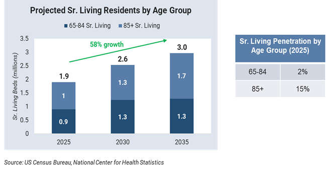 Senior living demand is projected to grow 35% over the next decade, driven primarily by approximately 60% growth in the over 85 population, assuming current penetration rates remain constant.