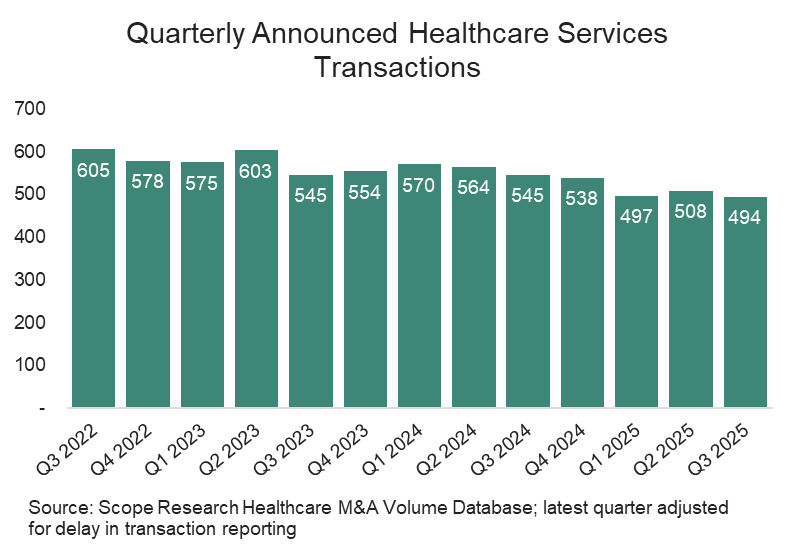 Total transaction activity in the third quarter of 2025 decreased slightly over the prior quarter for the healthcare services industry. While inflation remained relatively steady and the Federal Reserve cut rates at its September meeting as expected, these positive economic indicators were not enough to spur mergers and acquisitions (M&A) activity in the quarter.