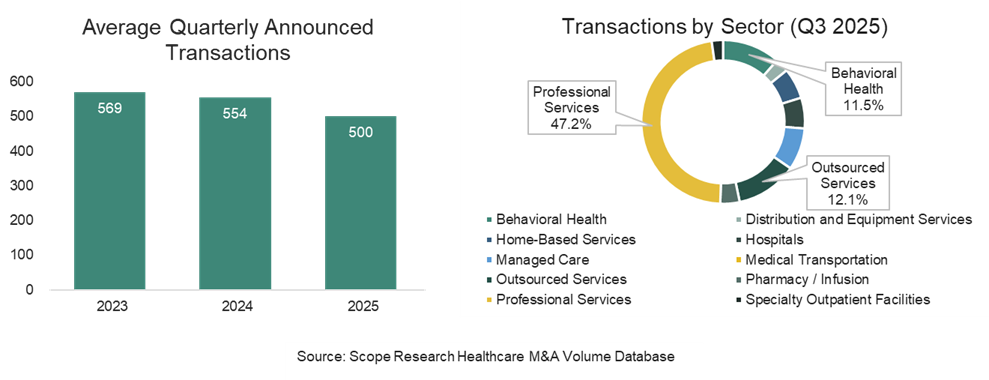 While Professional Services remained the most active sector, Q3 was the first quarter since 2022 where Professional Services represented less than 50% of total transactions. This decline in transaction activity was driven primarily by a 50% decrease in Dentistry, while Physician Practice acquisitions remained relatively steady.